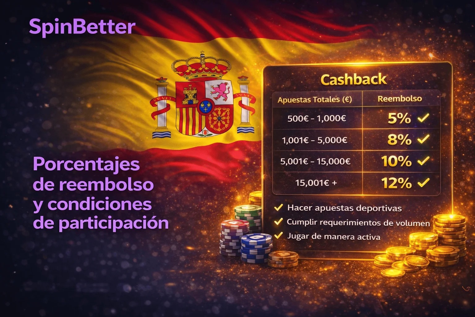 El bono de reembolso de SpinBetter se calcula a partir de las pérdidas netas del jugador en los juegos de las categorías elegibles. Estas categorías pueden incluir determinados juegos de casino o apuestas deportivas específicas, dependiendo de las condiciones vigentes de la promoción. El reembolso en apuestas deportivas es fijo y ofrece un 3 % de las apuestas perdidas (hasta 1000 EUR) todos los martes. El porcentaje de reembolso para los aficionados al casino depende del nivel del jugador y de las condiciones de la promoción vigente.